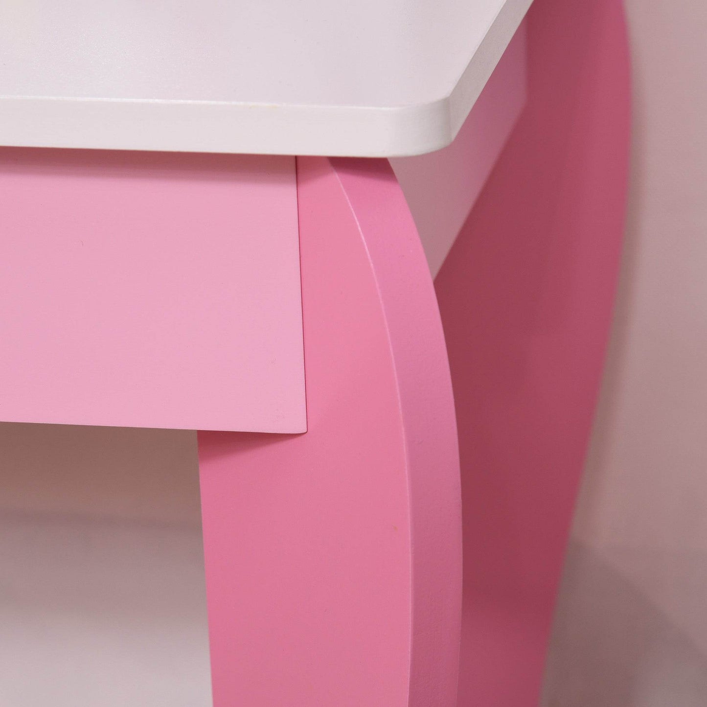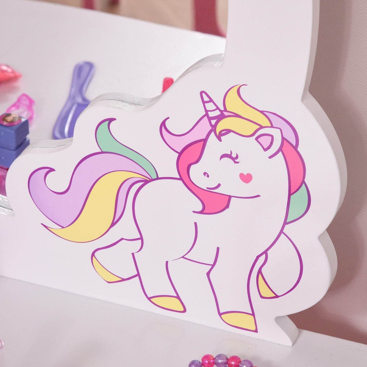 HOMCOM Unicorn-Themed Kids Vanity Set with Acrylic Mirror and Stool for Ages 3-6 - Pink and White