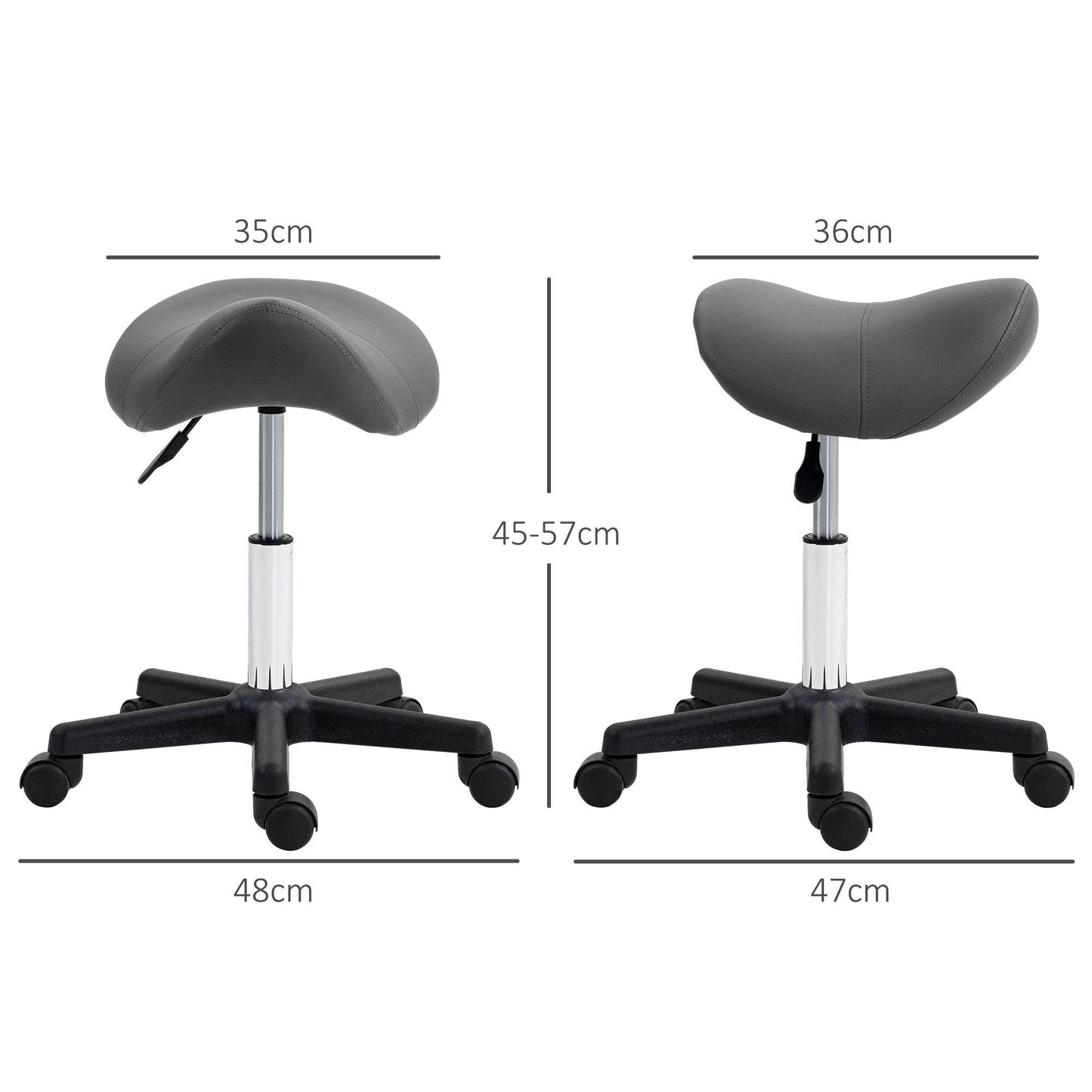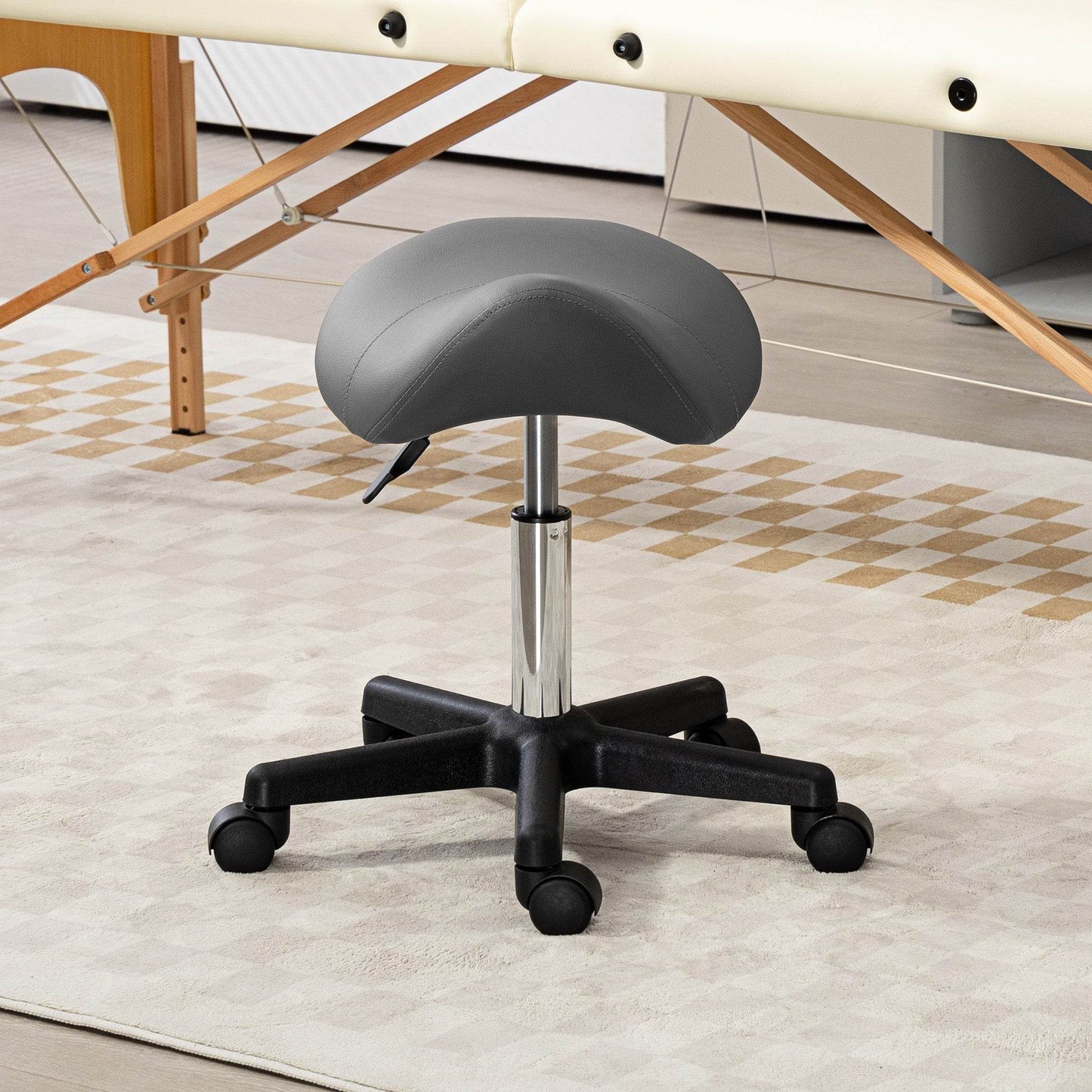HOMCOM Adjustable Grey PU Leather Saddle Stool with Rolling Wheels for Salon and Spa Use