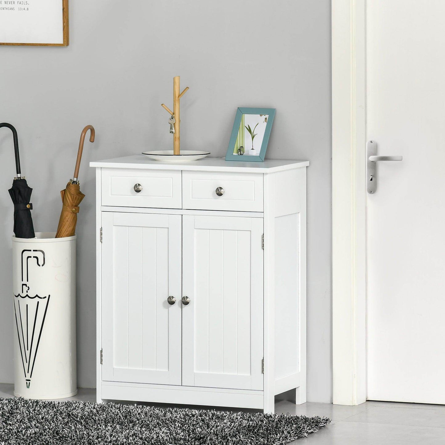 - Ample Storage Space: Featuring a spacious cupboard, two drawers, and an adjustable shelf, this cabinet offers plenty of room for all your bathroom essentials.